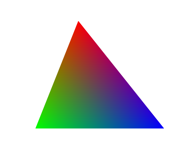 To demonstrate, above is a triangle whose vertices are red, green and blue with the colors in between interpolated using barycentric coordinates. For example, the barycentric coordinates at the red corner are (1, 0, 0), indicating that the point is maximally close to the red corner and therefore, the color should be as close to red as possible. The point directly in between the red and green corners has barycentric coordinates (0.5, 0.5, 0), showing that it is equidistant from the red and green corners and it should therefore be a color that is 50% red and 50% green, corresponding to their barycentric coefficients. Lastly, the point in the median has barycentric coordinates (⅓, ⅓, ⅓), which implies an equal mixing of red, green, and blue. Every other point is interpolated using the same logic to create a visually appealing, yet simple color gradient.