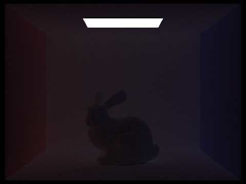 Here is CB Bunny with only direct illumination, and then only indirect illumination. We can see that with only direct illumination, we have hard shadows and no light reaching the ceiling.