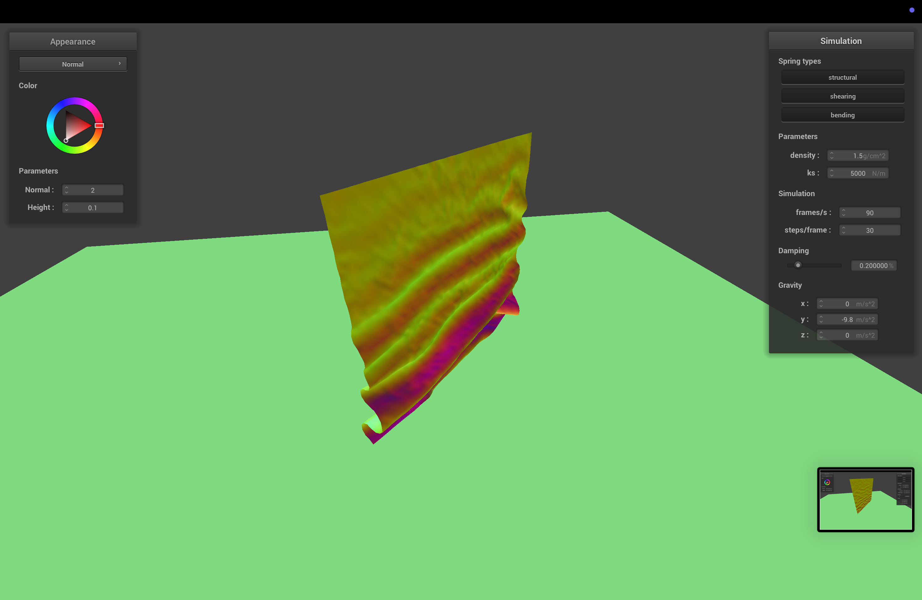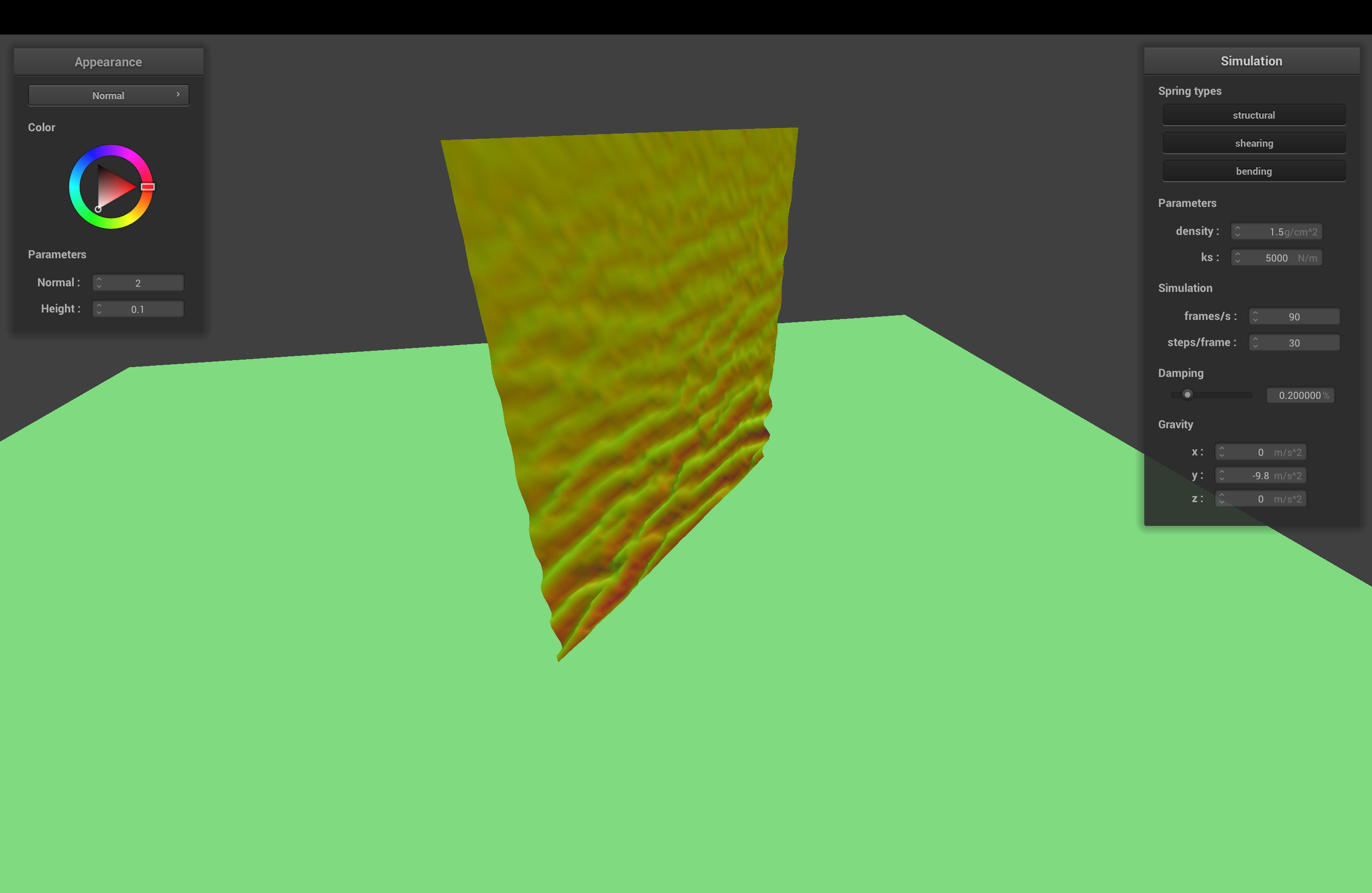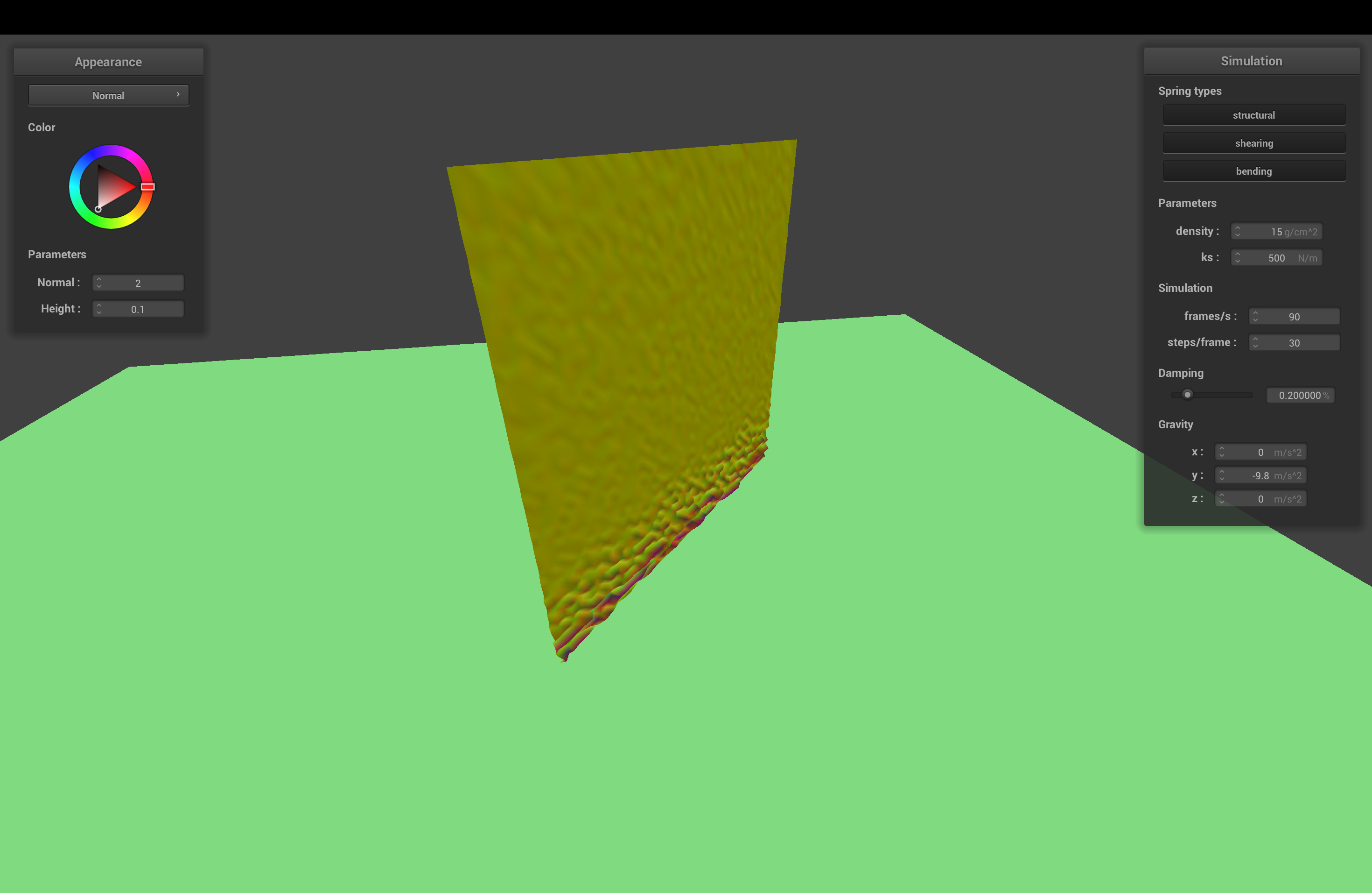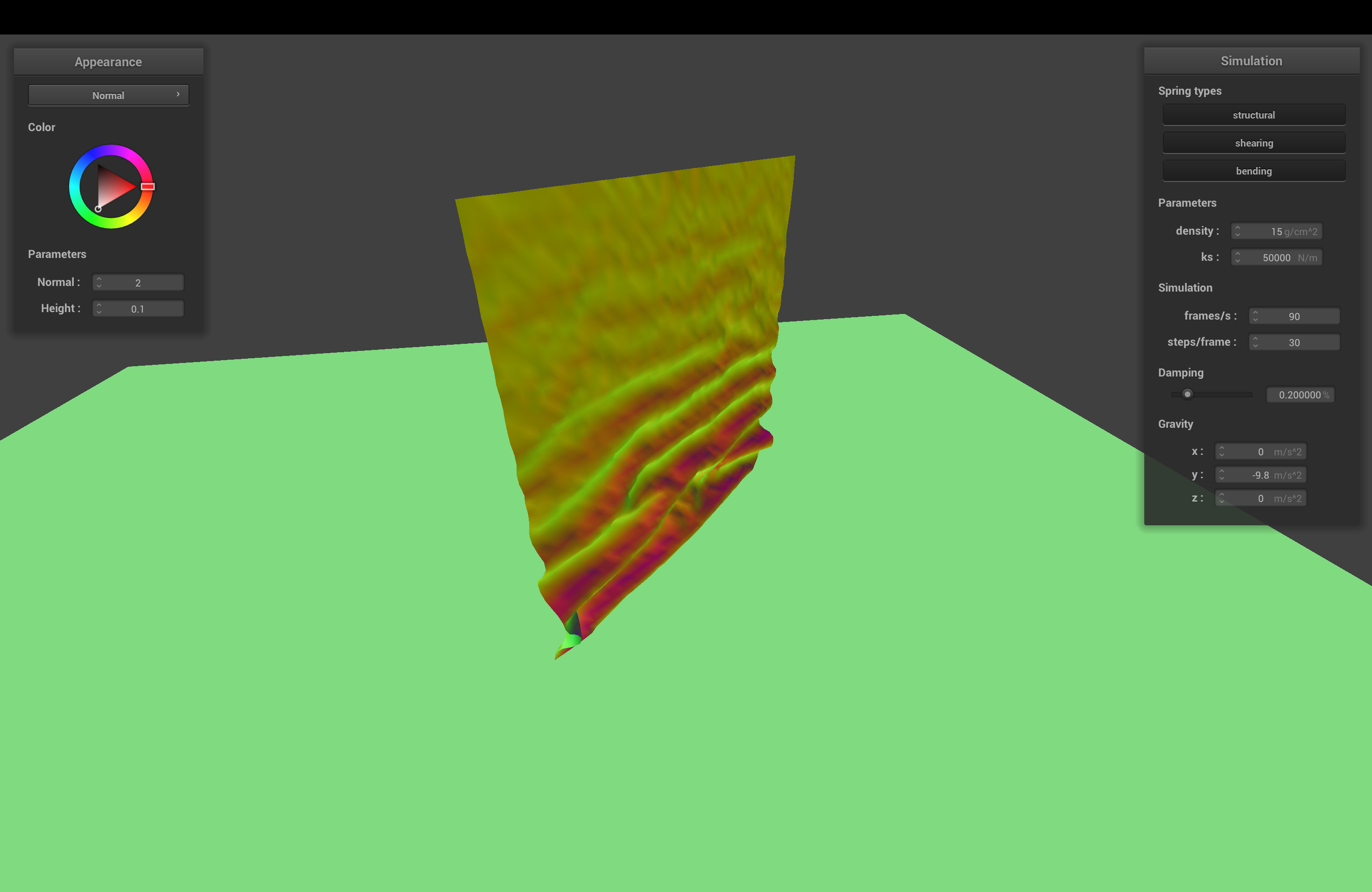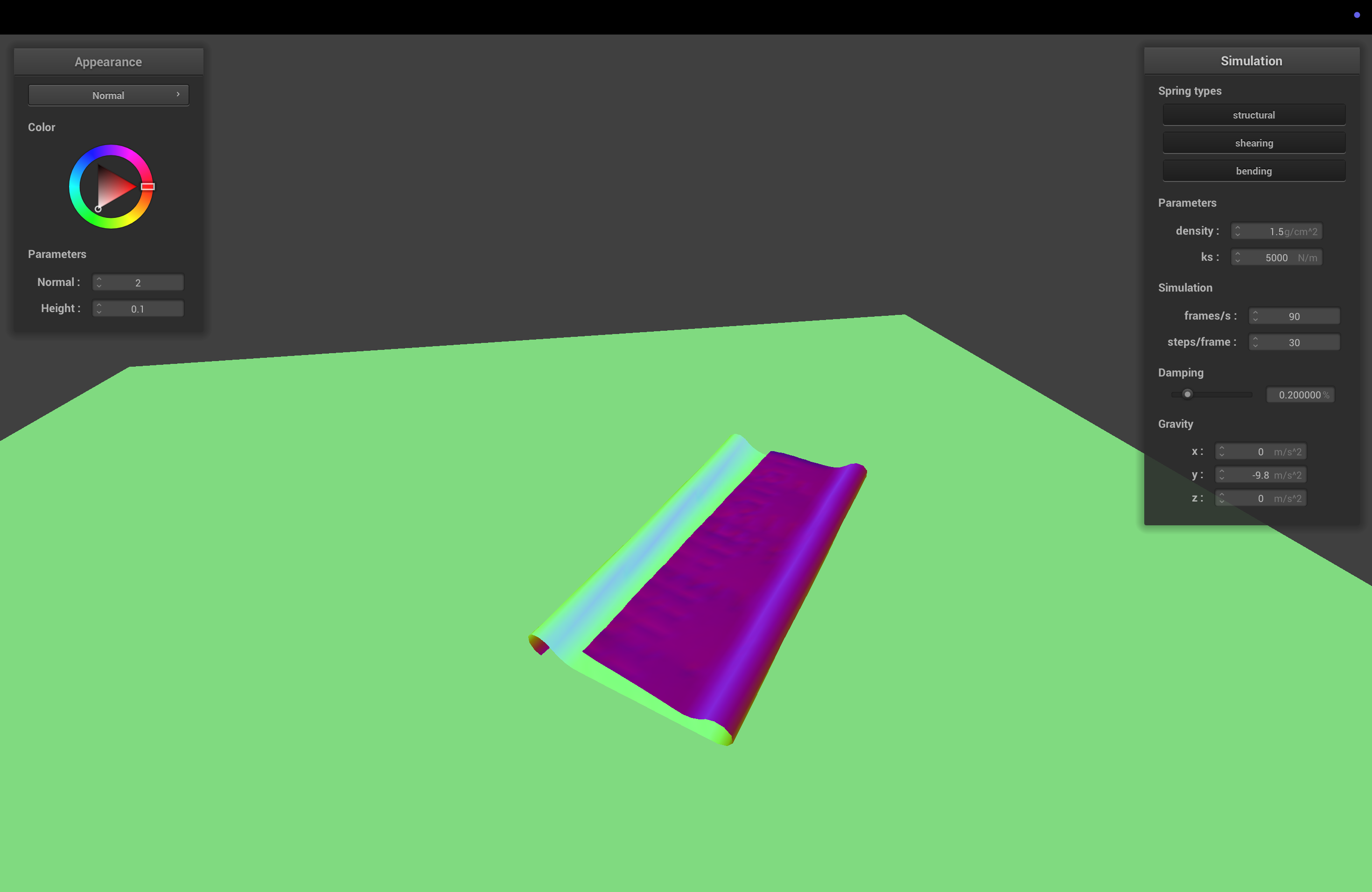 The spring constant determines how stiff the cloth is. With higher ks, the cloth becomes stiffer, and sags less when it comes to rest.