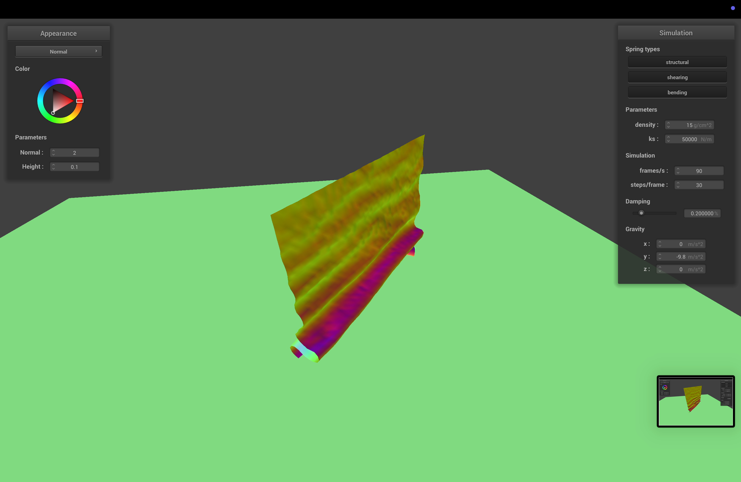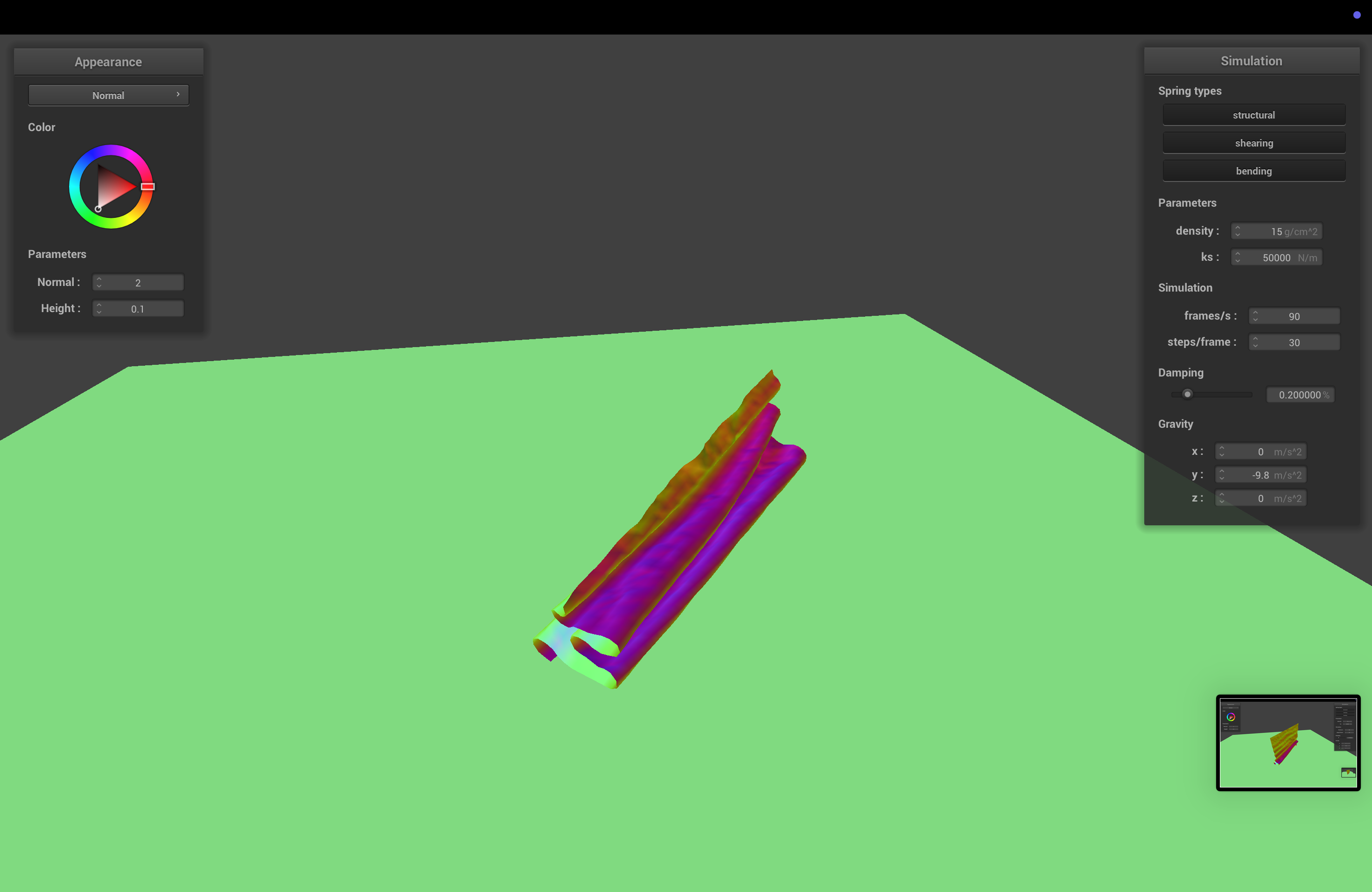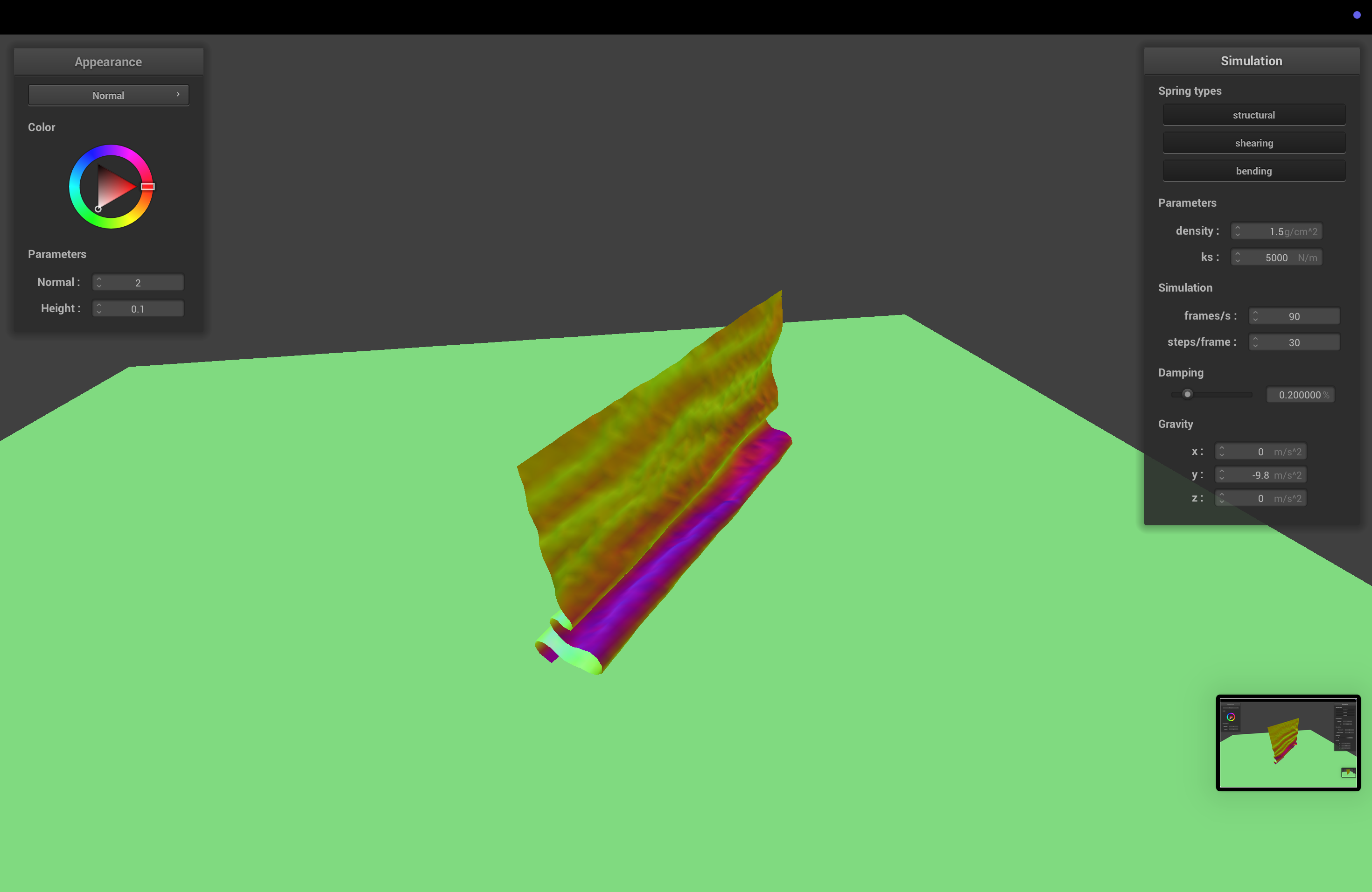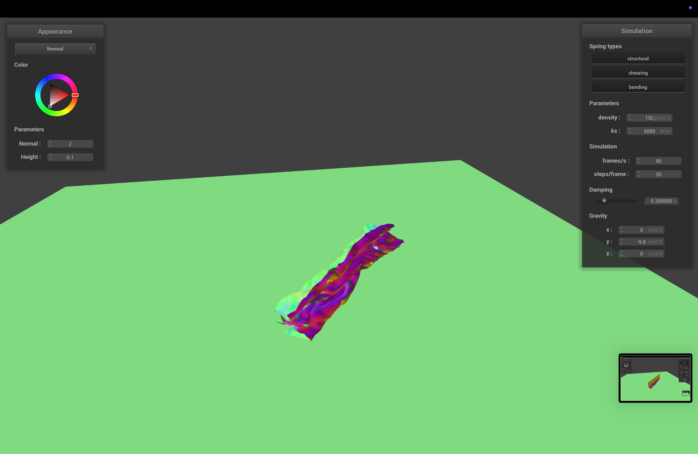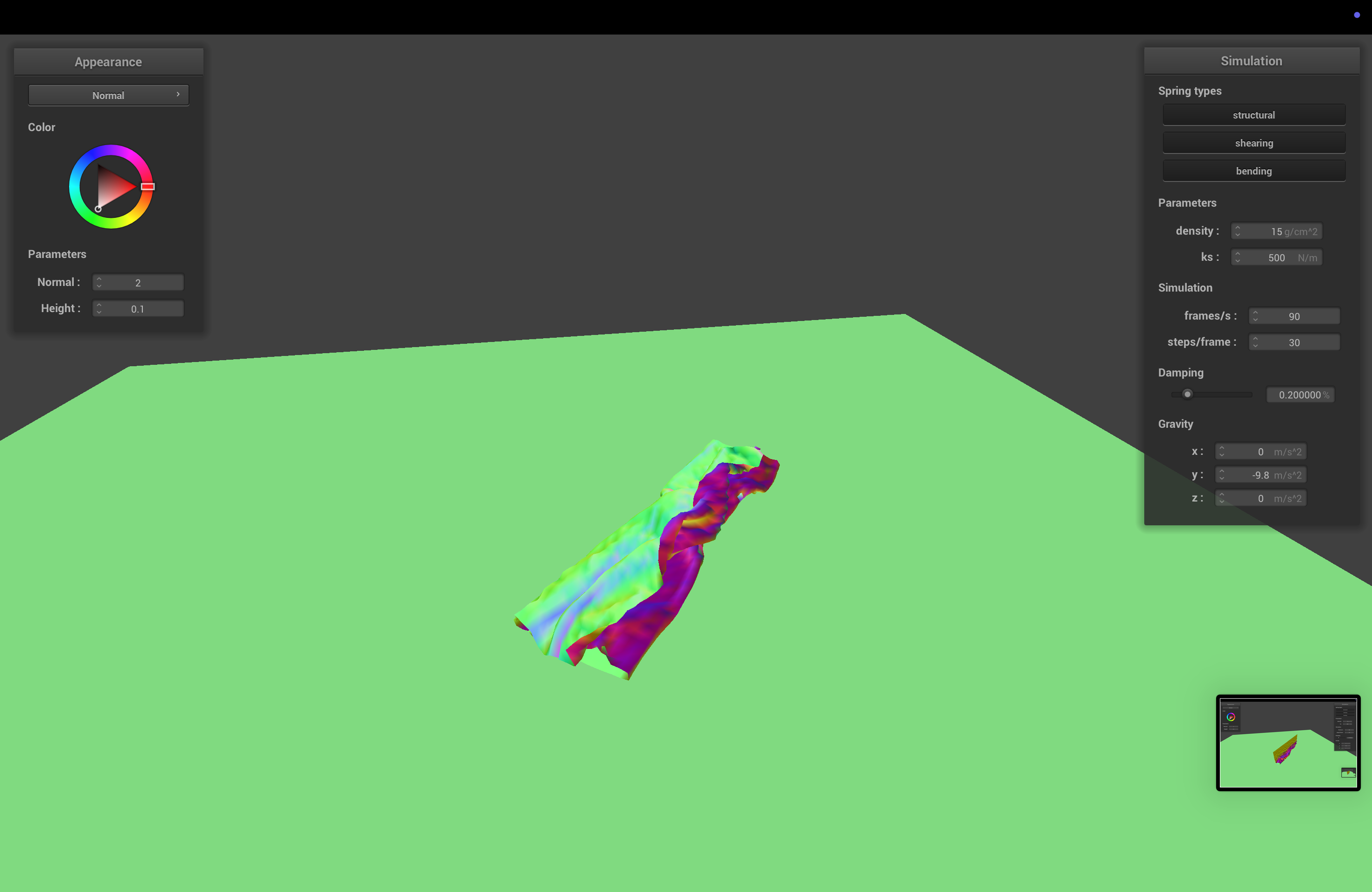 The spring constant determines how stiff the cloth is. With higher ks, the cloth becomes stiffer, and sags less when it comes to rest.